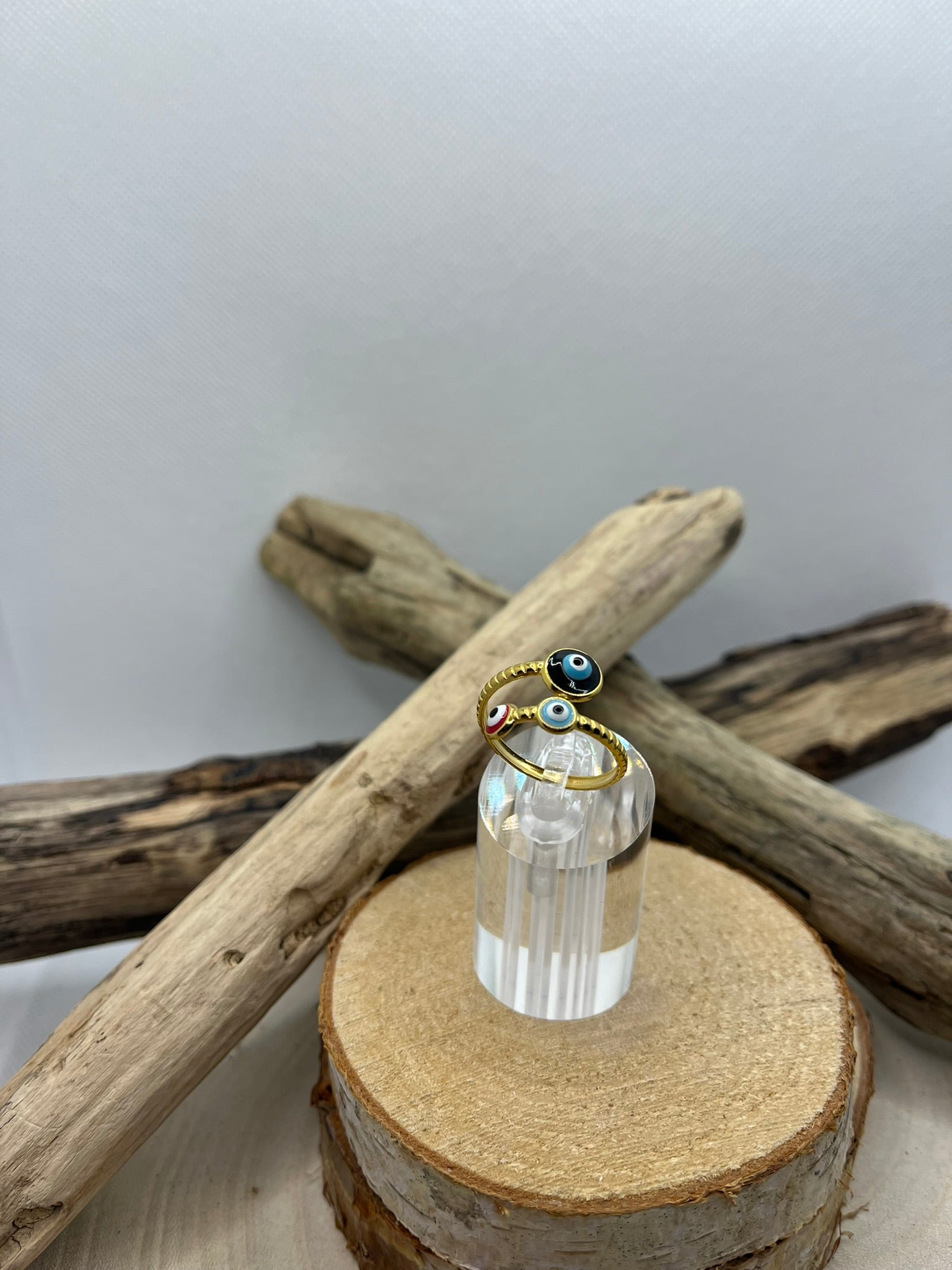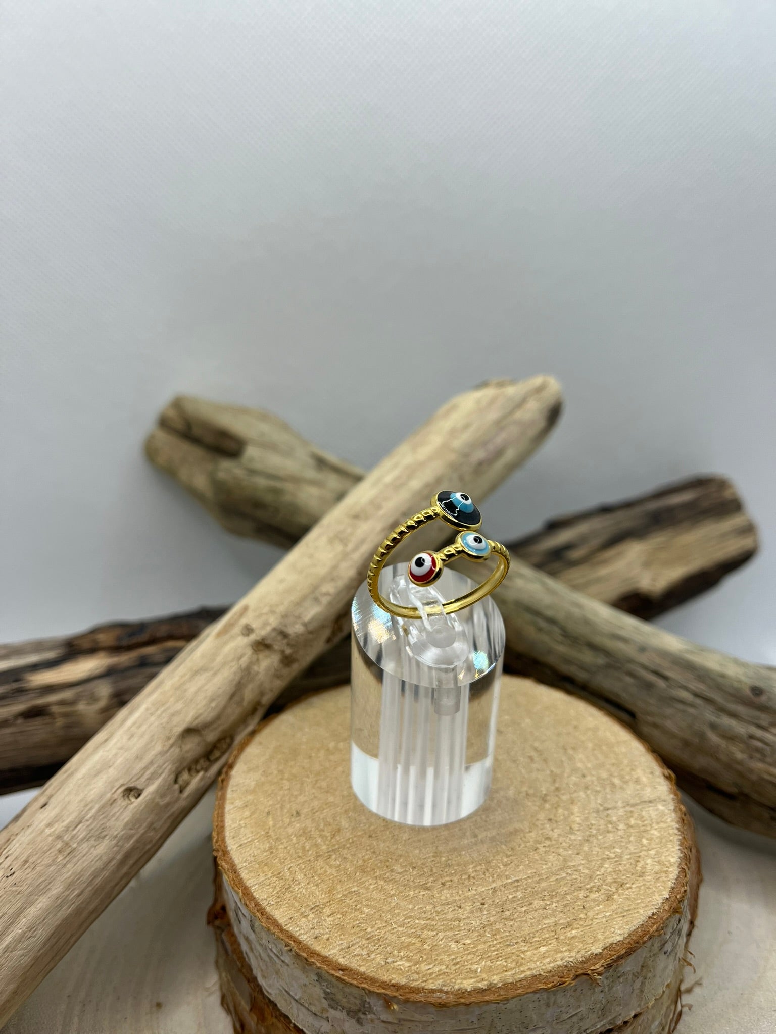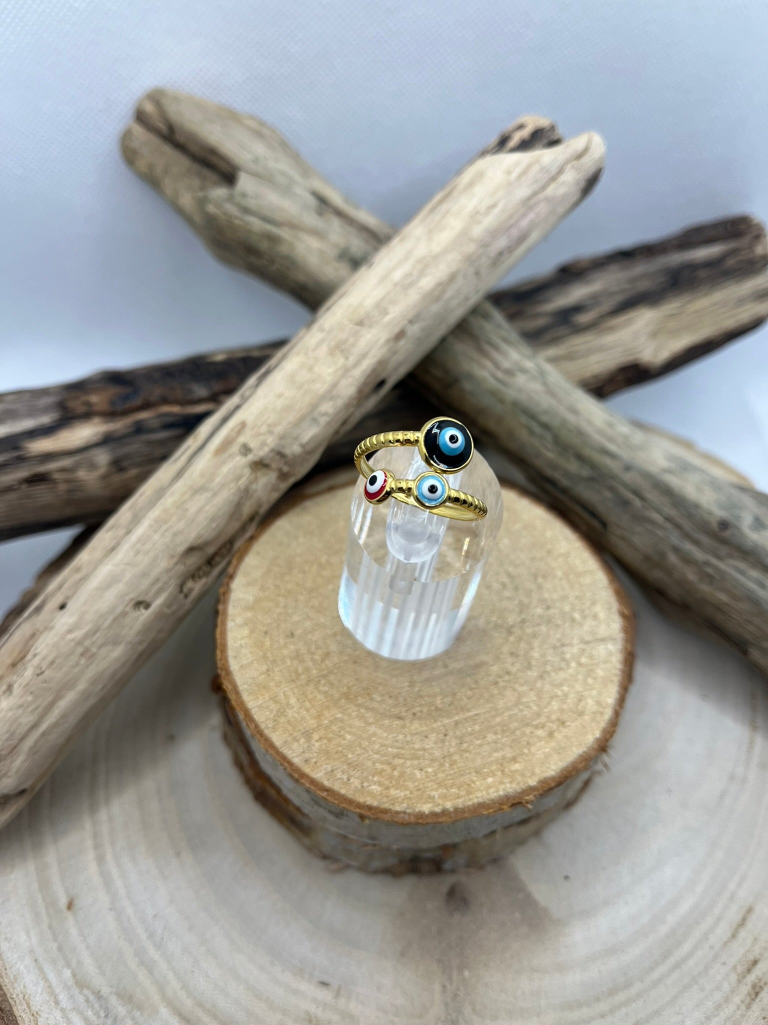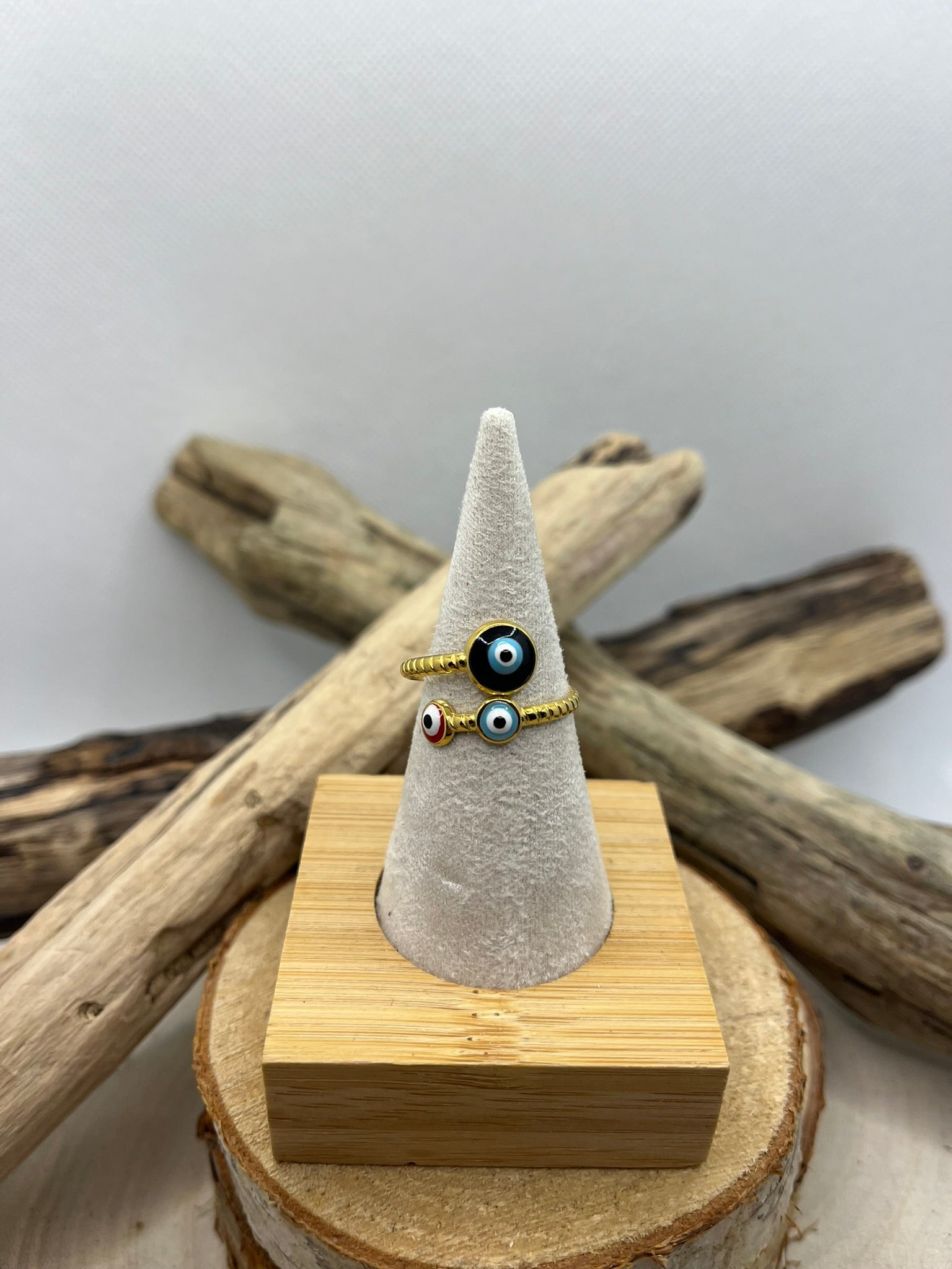 Bague Acier Inoxydable Ajustable - Perles Oeil Noir - Bleu - Rouge