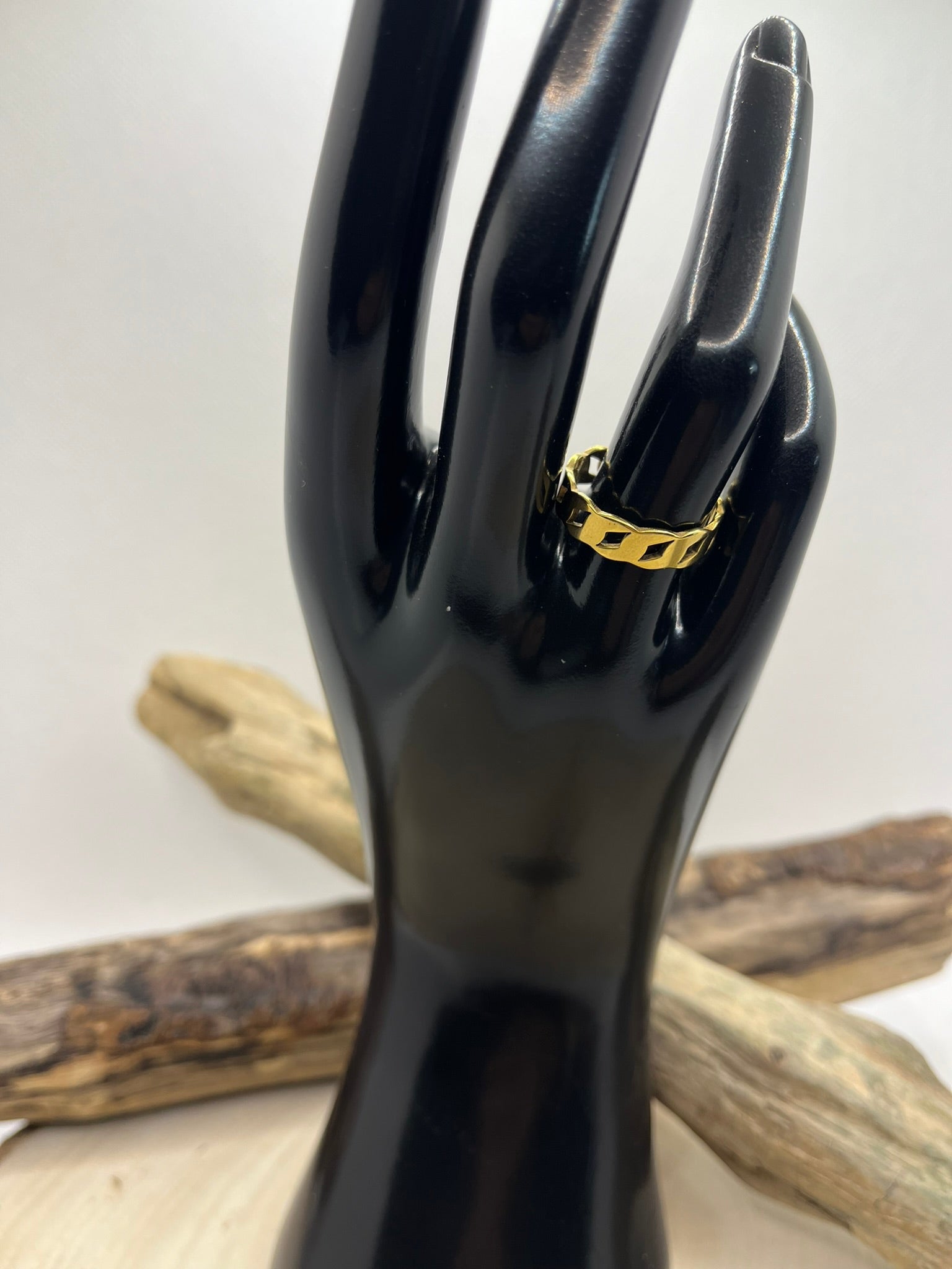 Cette bague en acier inoxydable tendance couleur doré est un accessoire ajustable à la mode. Fabriquée en acier durable, elle offre une résistance à la corrosion et un style contemporain. Ajoutez une touche d'élégance à votre tenue avec cette bague tendance et facile à porter.