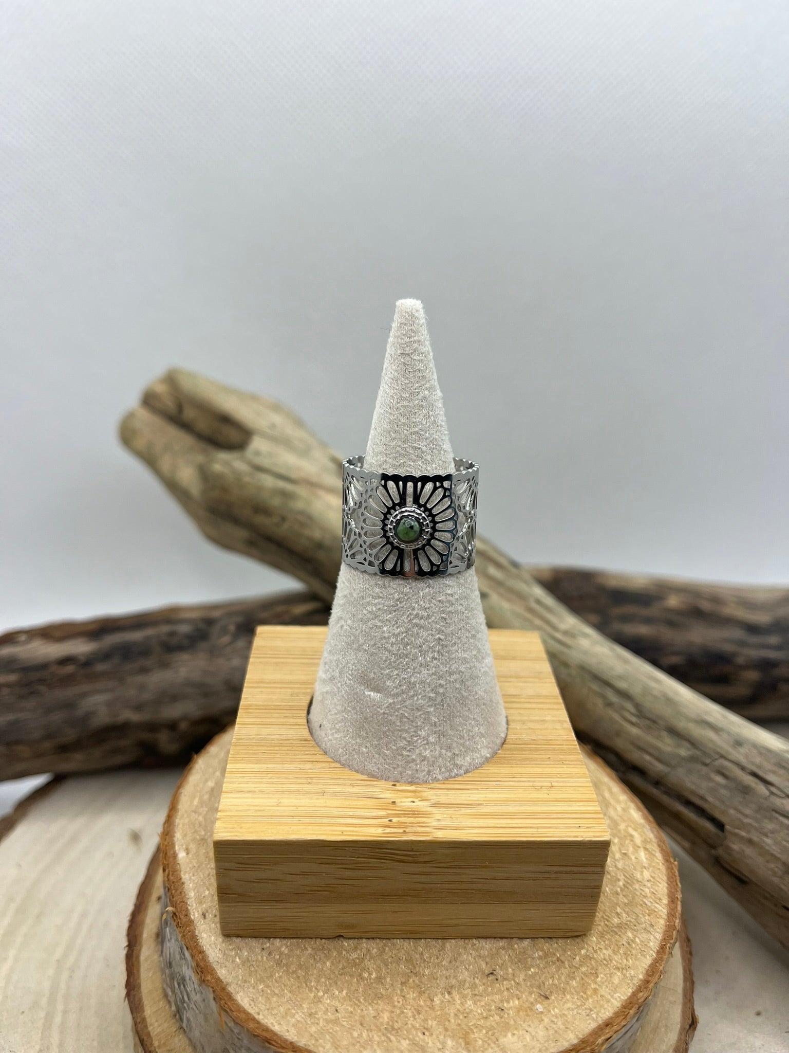 Bague large en Acier inoxydable ajustable mode et sa petite perles verte - Argenté