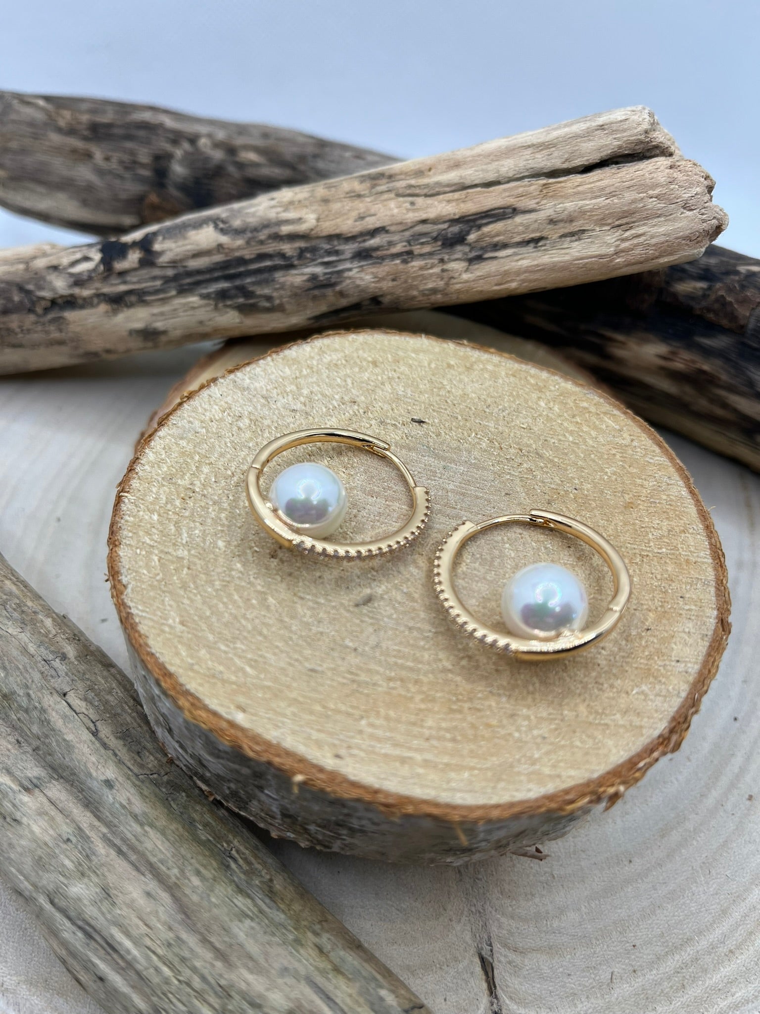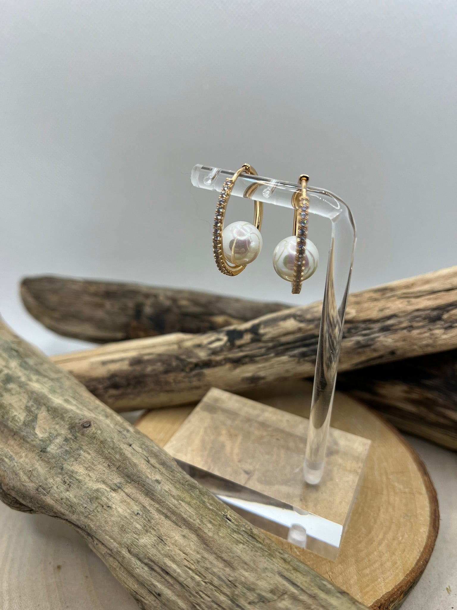 Boucles d'oreilles créoles ornés de strass et d'une perle nacre - Acier inoxydable doré