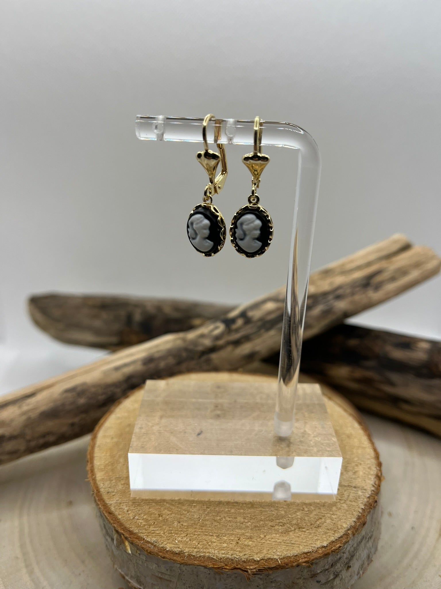 Boucles d'oreilles Dormeuse Acier Inoxydable doré pendentif "Camée" noir doré - 13mm x 11mm