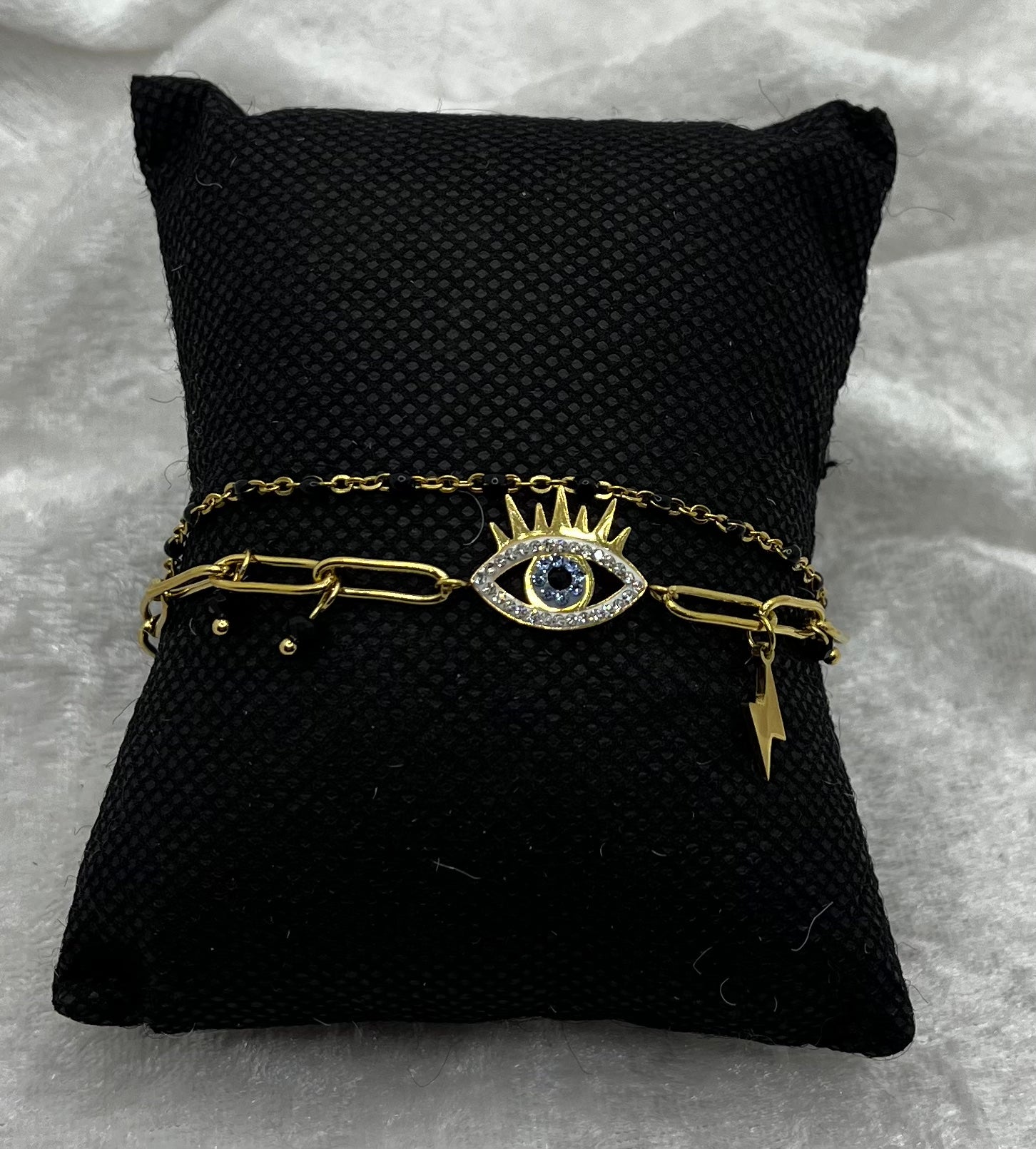 Ce bracelet magnifique et élégant à 2 chaînes en acier inoxydable doré comporte un œil orné de strass pour un look chic et intemporel. Une pièce de bijouterie élégante pour complémenter votre style.
