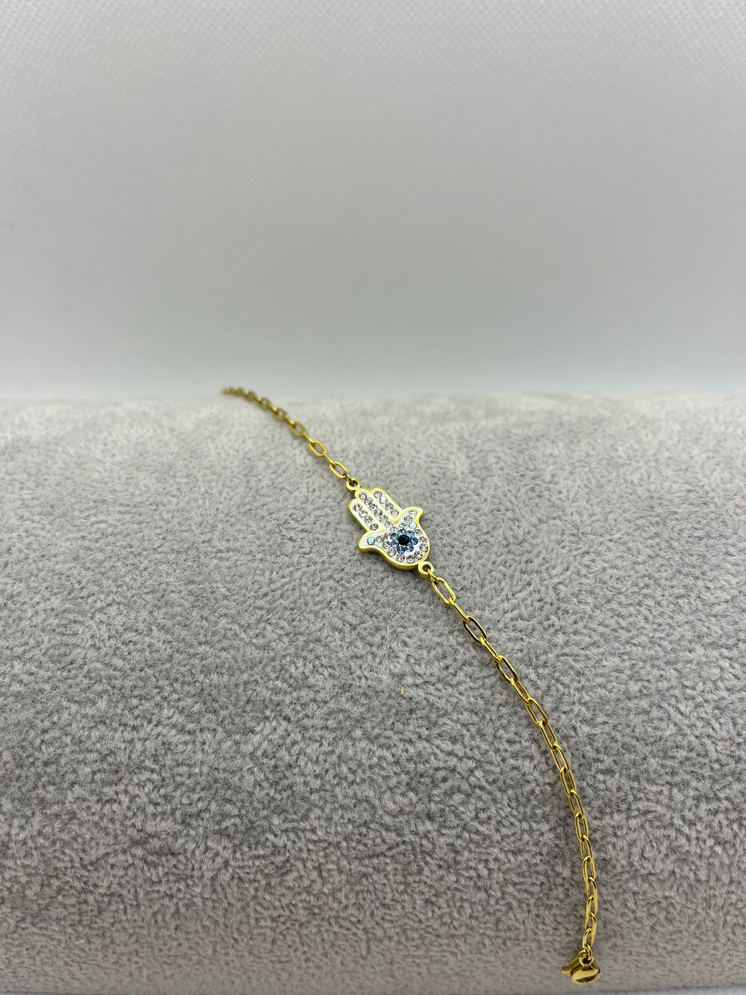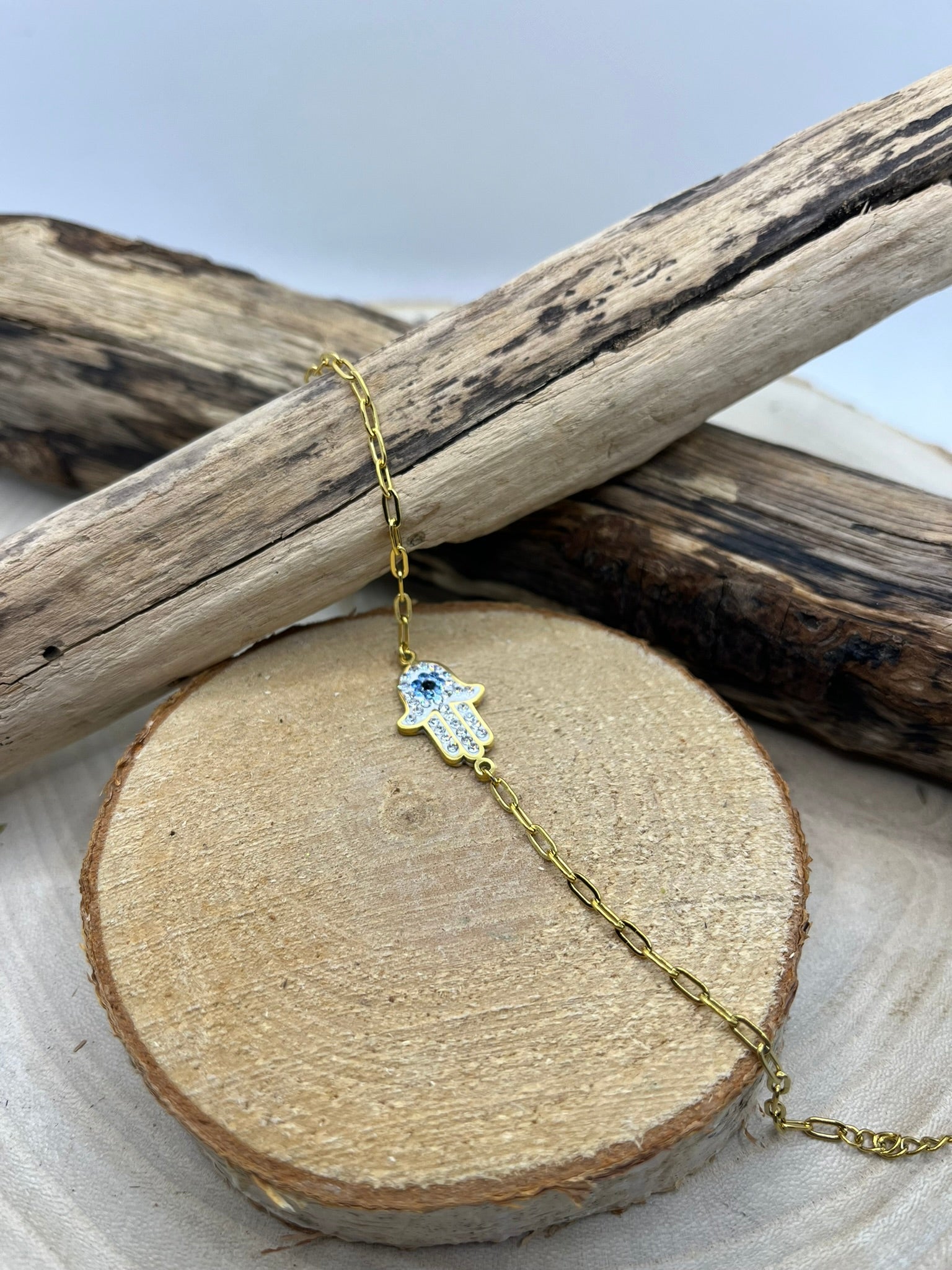 Bracelet Chaine Maillon fine avec Main et ornée de strass - Acier inoxydable - Doré