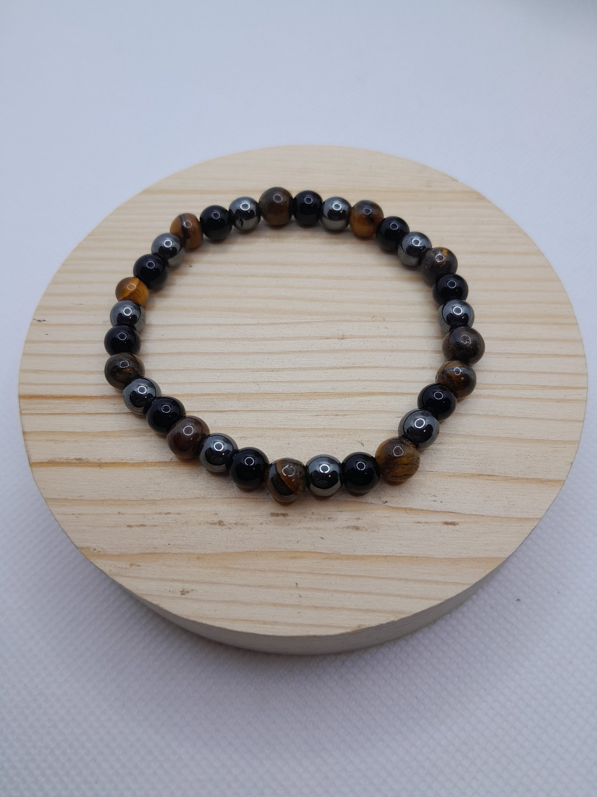 Ce bracelet en pierre naturelle offre la protection ultime et peut aider à retrouver l'harmonie et la confiance en soi. Fabriquée avec de l’œil de Tigre, de l'Hématite et de l'Onyx, cette pièce peut apporter un sentiment de bonheur, et libérer des émotions négatives. Un bijou à la fois protecteur et bienfaisant.