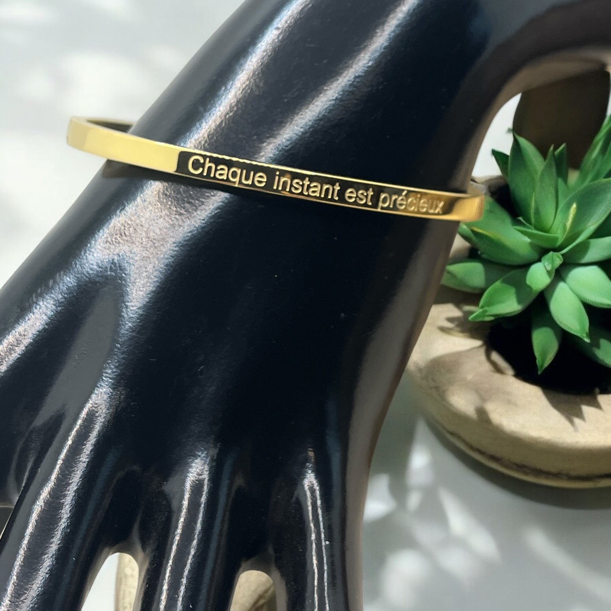 Bracelet Jonc à message ( Chaque instant est précieux ) Acier inoxydable Doré ou Argenté