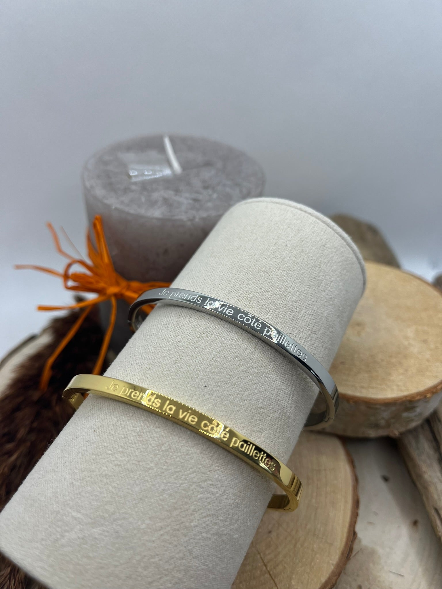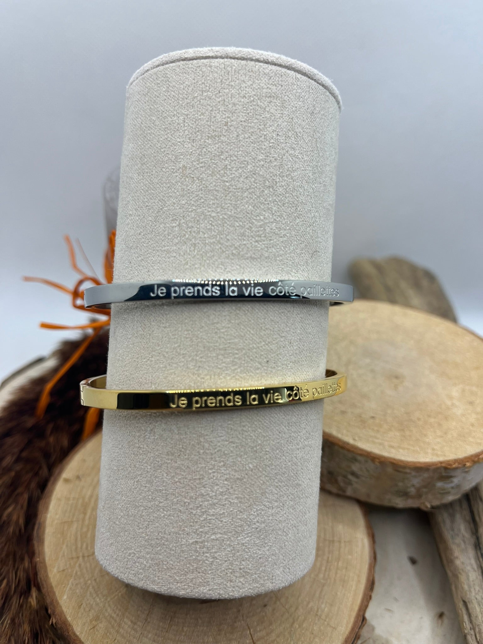 Bracelet Jonc à message ( Je prends la vie côté paillettes ) Acier inoxydable Doré ou en argenté