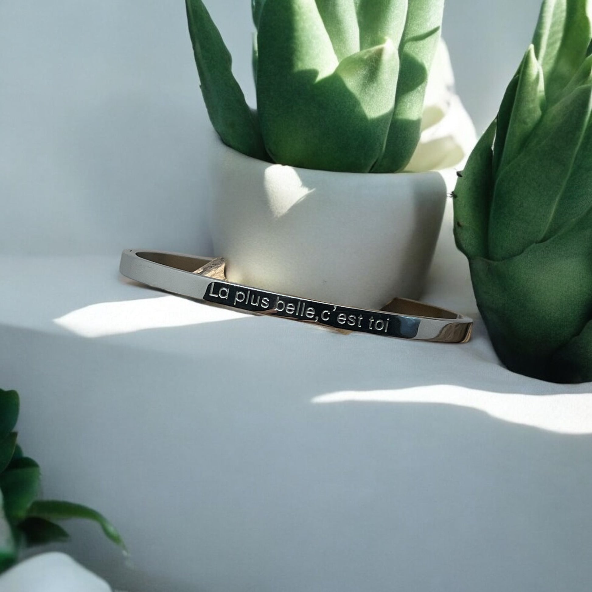 Affichez ce bracelet jonc à message "La plus belle c'est toi". Fabriqué en acier inoxydable, ce bracelet est à la fois durable et élégant. Un cadeau parfait pour toute occasion.