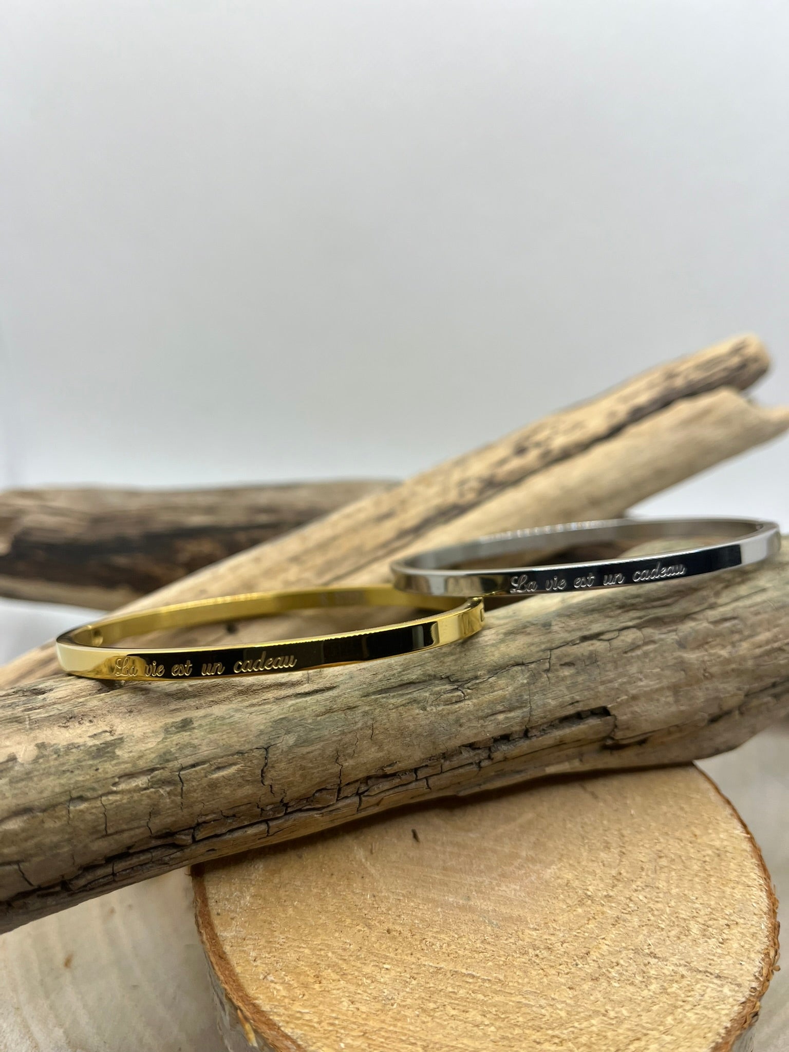 Bracelet Jonc à Message ( La vie est un cadeau ) - Acier Inoxydable Doré ou en Argenté
