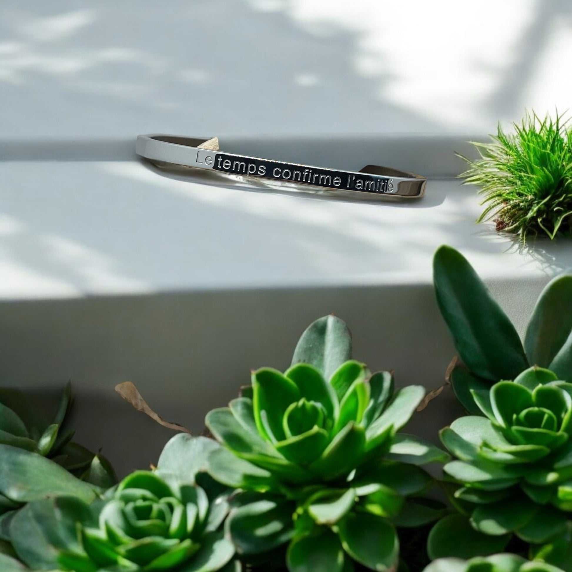 Ce bracelet jonc à message "Le temps confirme l'amitié". Fabriqué en acier inoxydable, ce bracelet est à la fois durable et élégant. Un cadeau parfait pour votre meilleure amie qui lui rappellera chaque jour votre lien fort et durable.