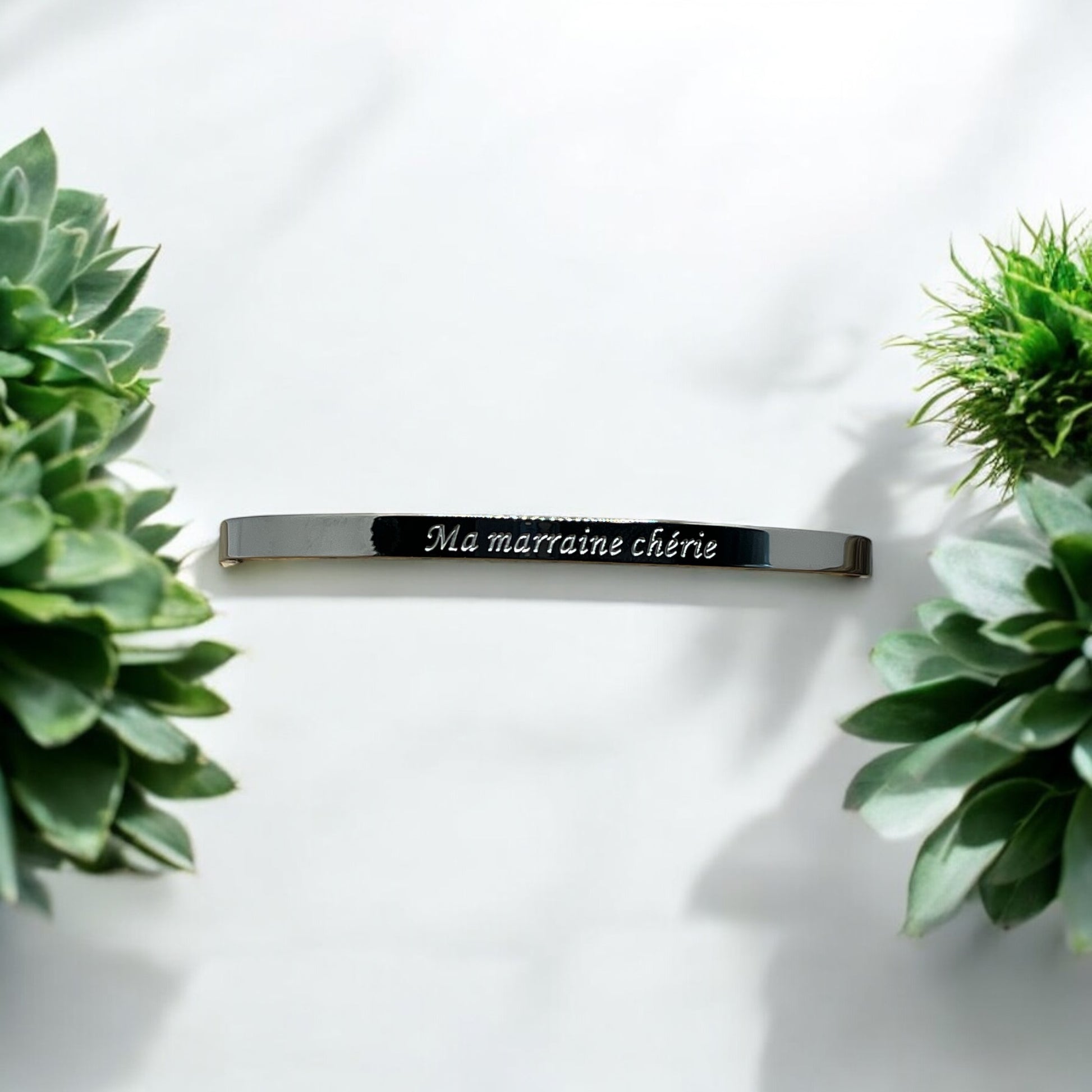 Ce bracelet jonc en acier inoxydable est le cadeau parfait pour votre marraine bien-aimée. Avec son message personnalisé gravé, elle se souviendra toujours de votre affection. Disponible en doré ou en argenté, il ajoutera une touche élégante à sa tenue de tous les jours. Faites-lui savoir à quel point elle compte pour vous avec ce bracelet unique.