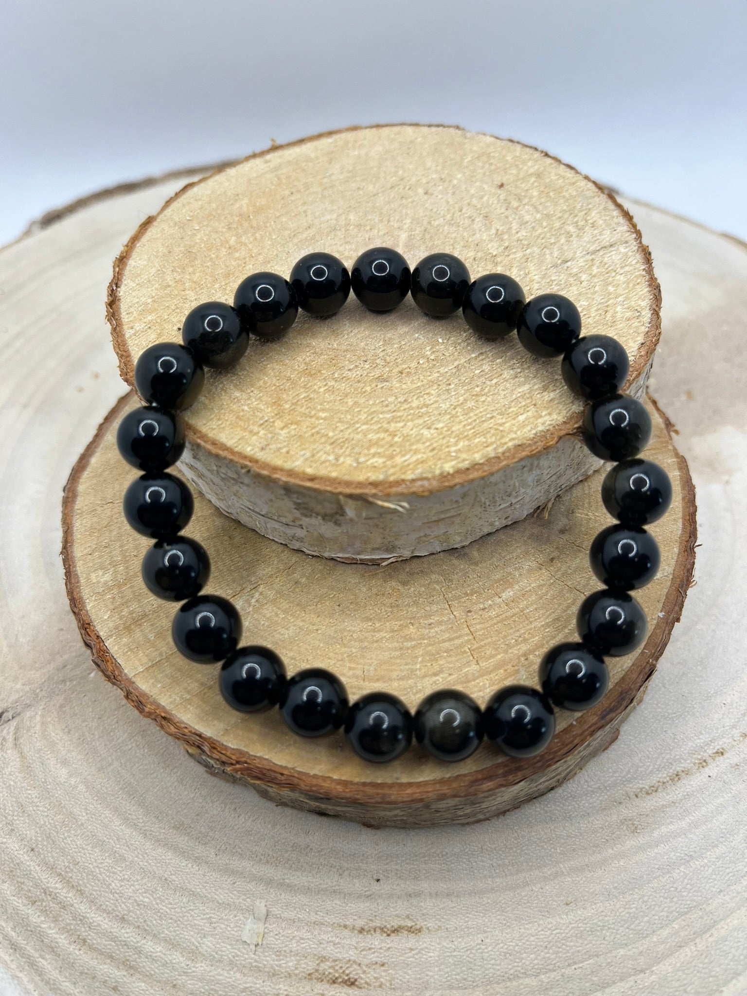 - L’obsidienne noire argentée ou céleste) dissout les colères, et apporte une grande force vitale.