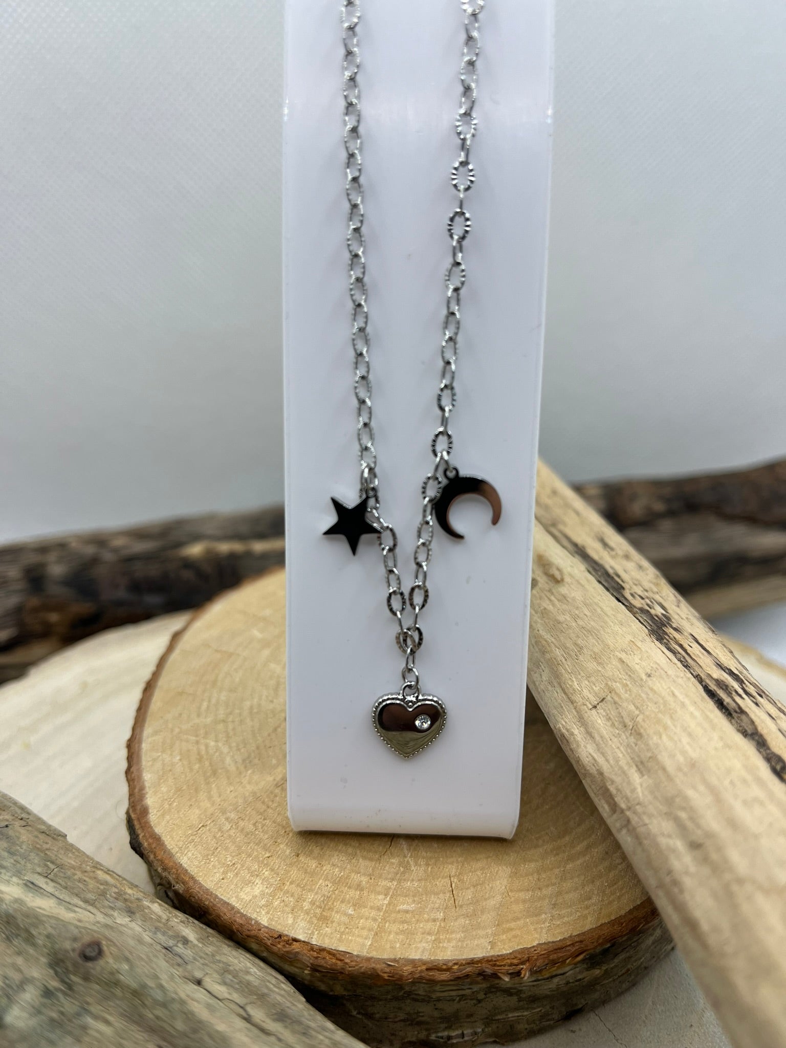 Collier Chaîne fine argenté en acier Inoxydable, Avec ces Pendentif Coeur, étoile, Lune
