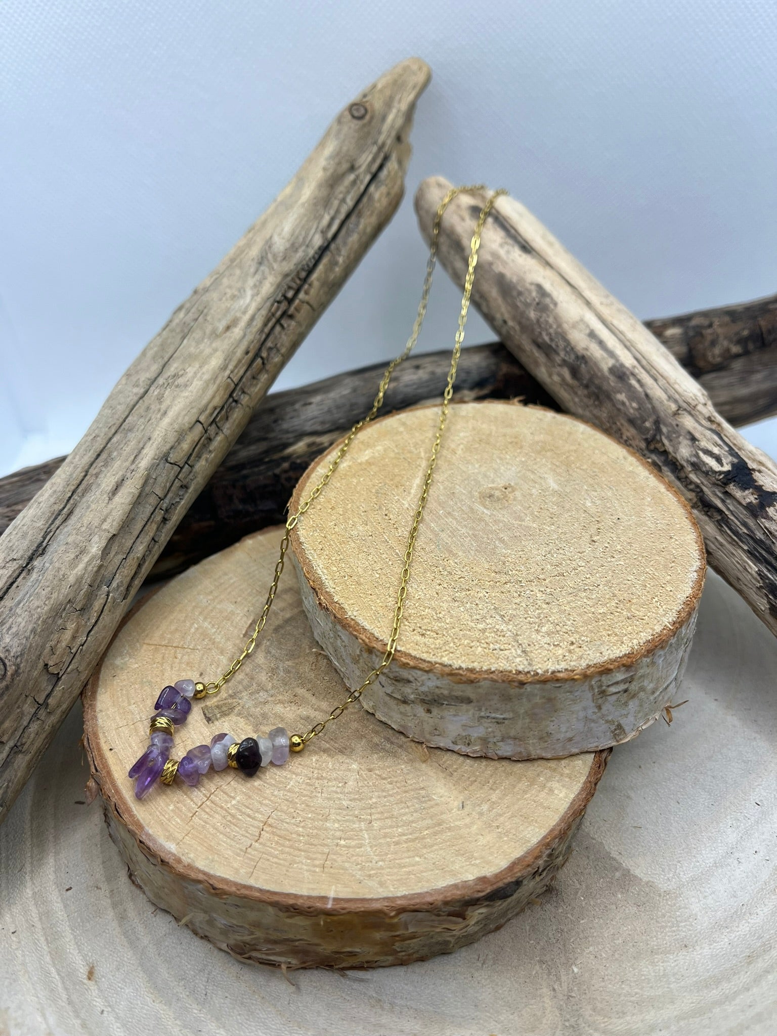Ce collier fin en acier inoxydable doré est orné de pierres naturelles d'améthyste. Sa chaîne fine ajoute une touche délicate à toute tenue, tandis que les pierres d'améthyste ajoutent une touche de couleur et de beauté naturelle. Parfait pour un look élégant et unique.