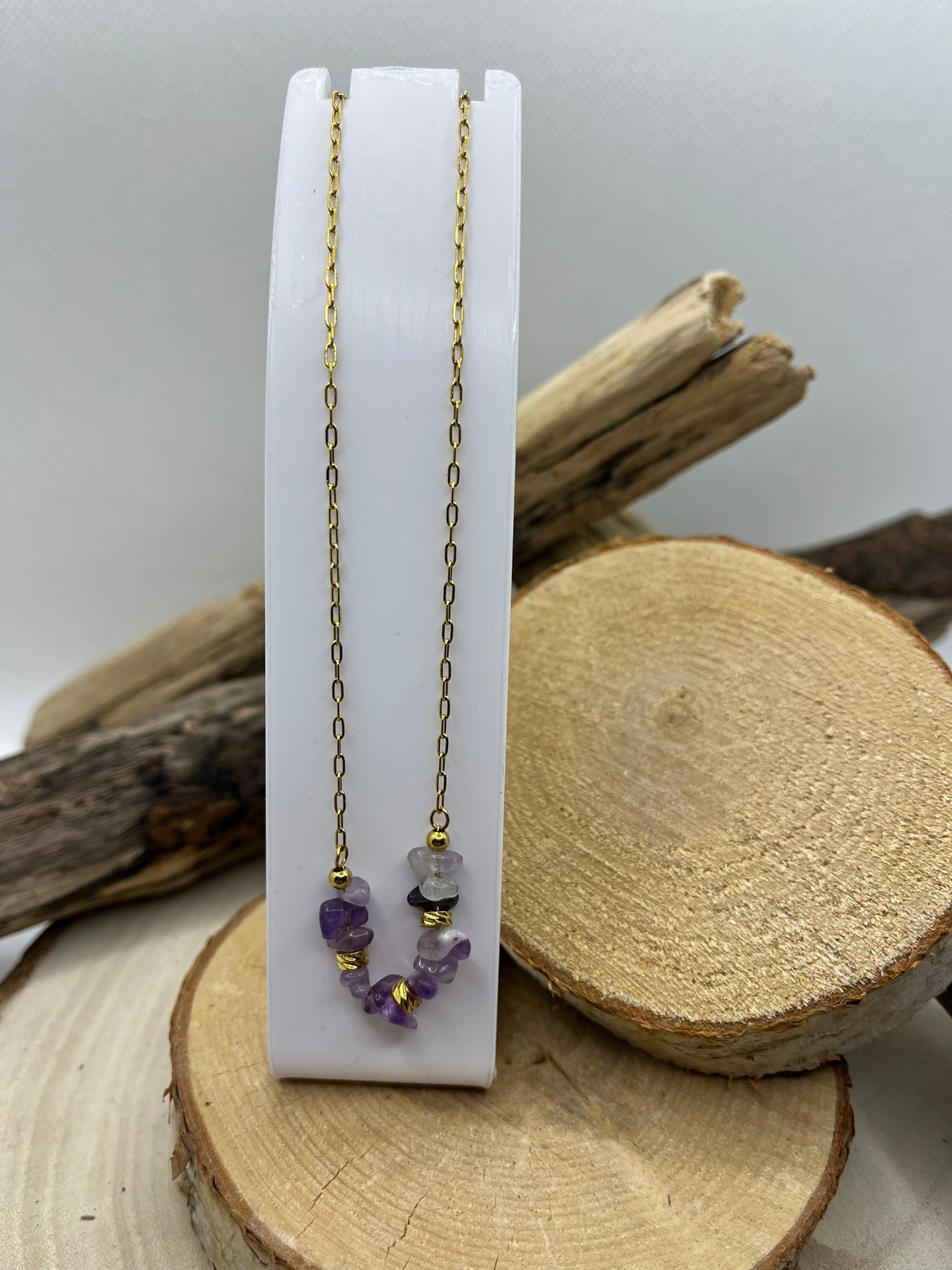Collier chaine fine en Acier Inoxydable Doré Orné de Pierres Naturelles Améthyste