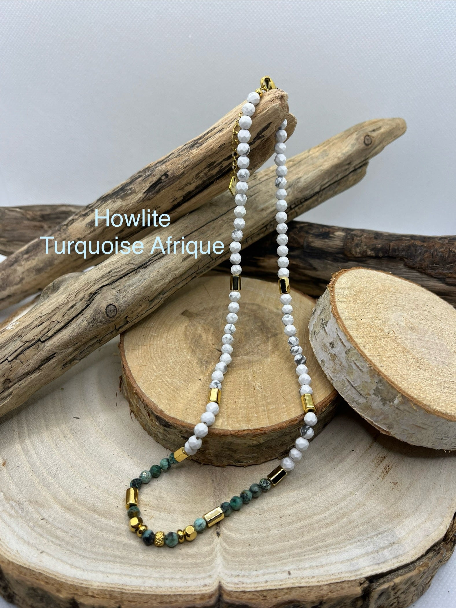 Collier en Pierres Naturelles Howlite et Turquoise Afrique orné de perles Acier inoxydable