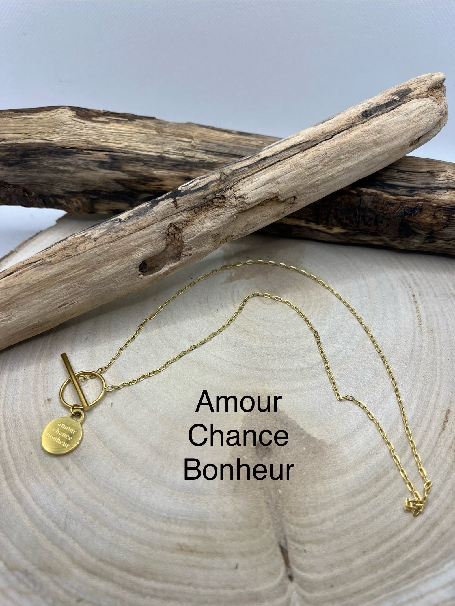 Collier Femme Chaine fine Chic et Mode avec Message gravé " amour, chance, bonheur" - Acier Inoxydable Doré