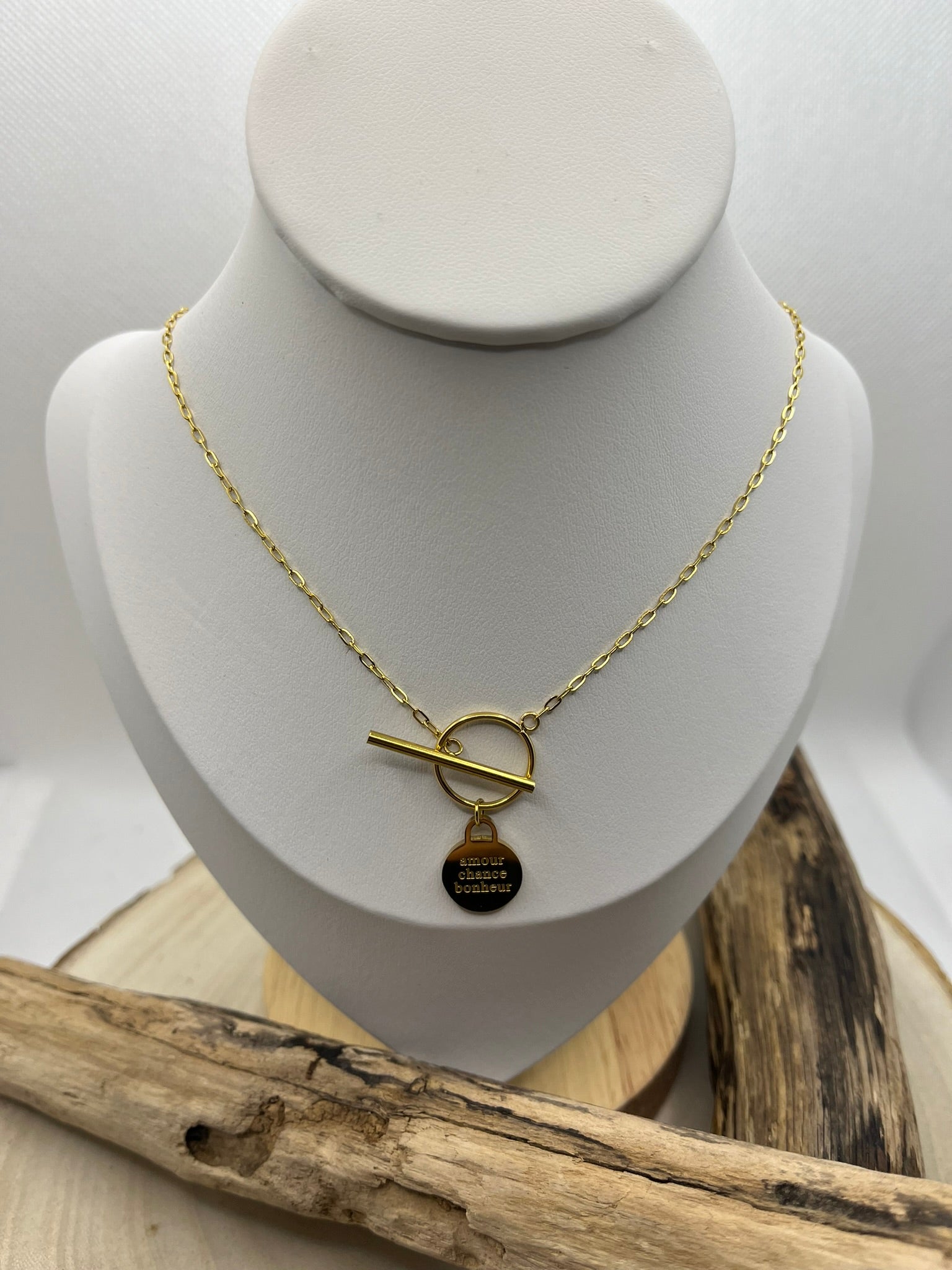 Ce collier en acier inoxydable doré sera un ajout élégant à votre tenue. La fine chaîne met en valeur un message gravé qui évoque l'amour, la chance et le bonheur. Un bijou chic et mode qui portera un message d'espoir et de positivité.
