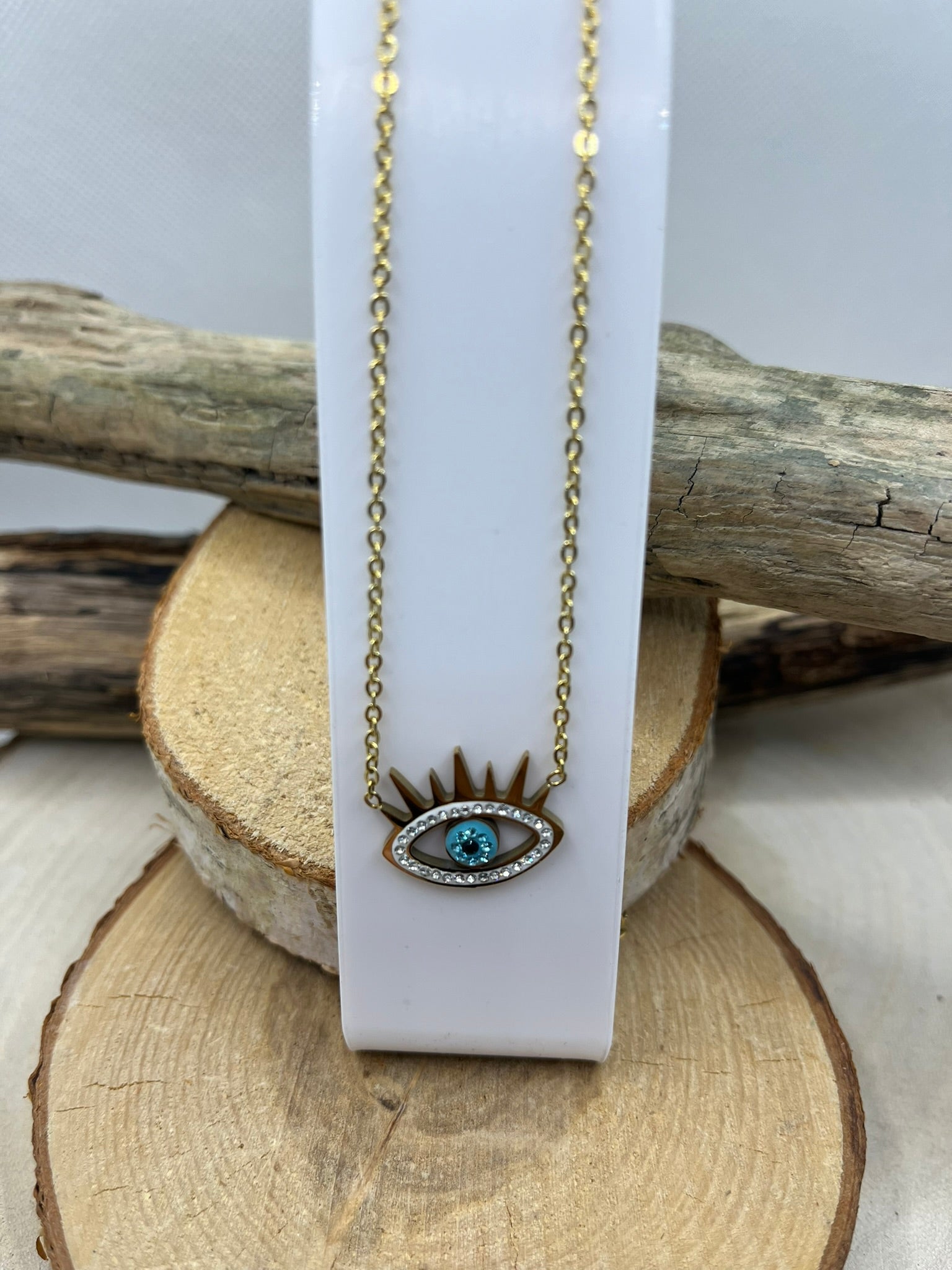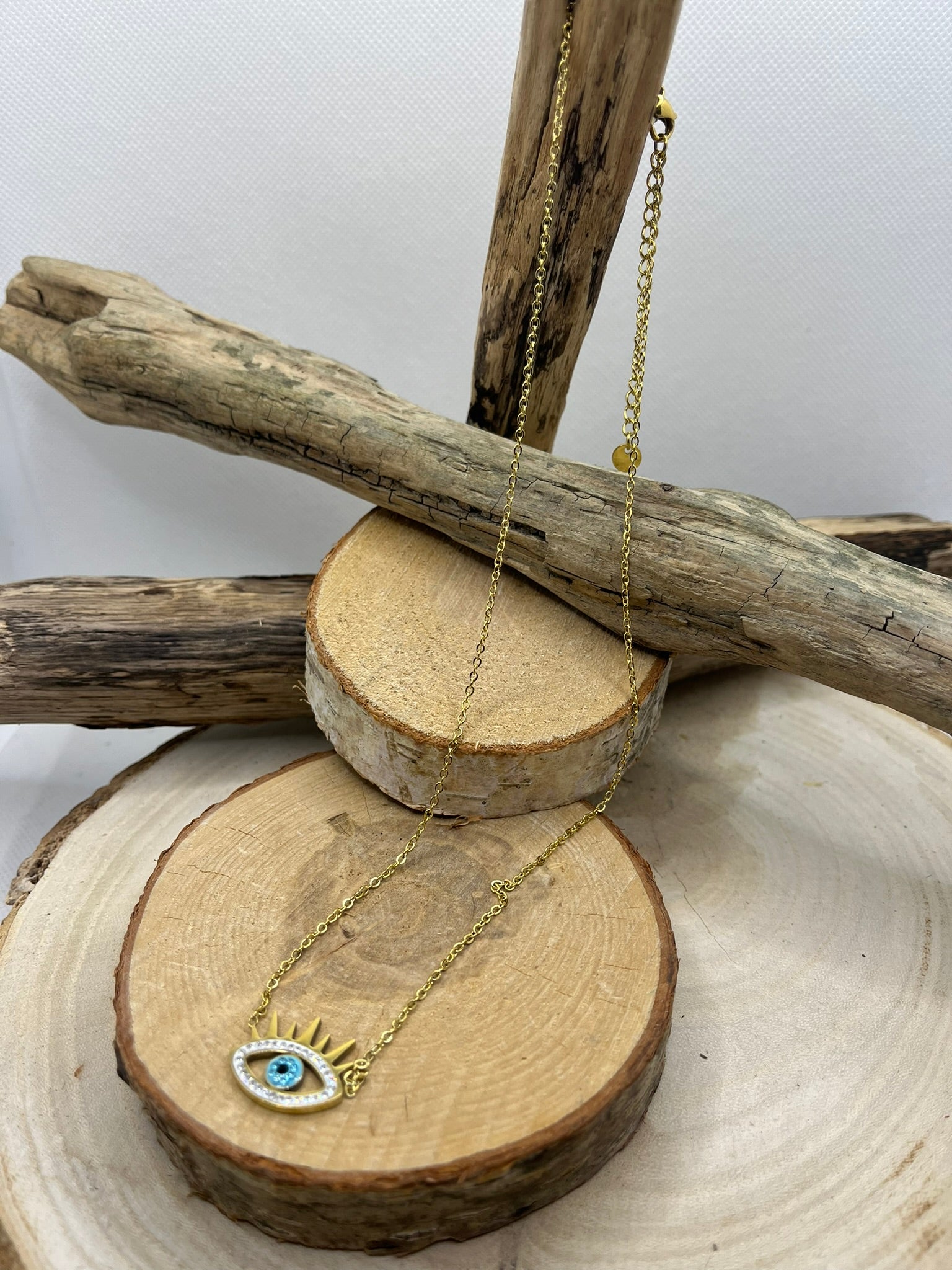 Collier Femme Chaine fine Pendentif oeil orné de strass - Acier Inoxydable Doré