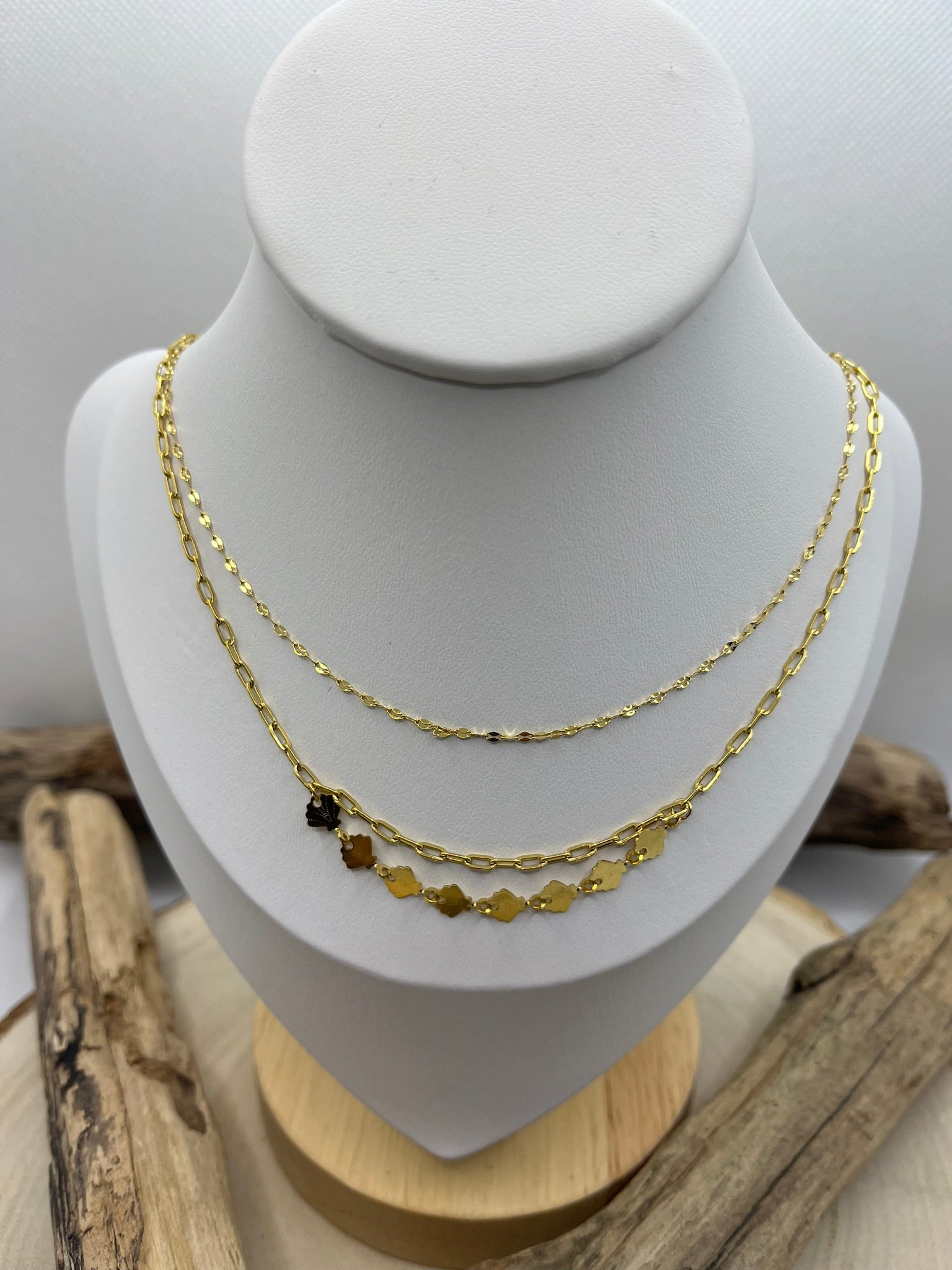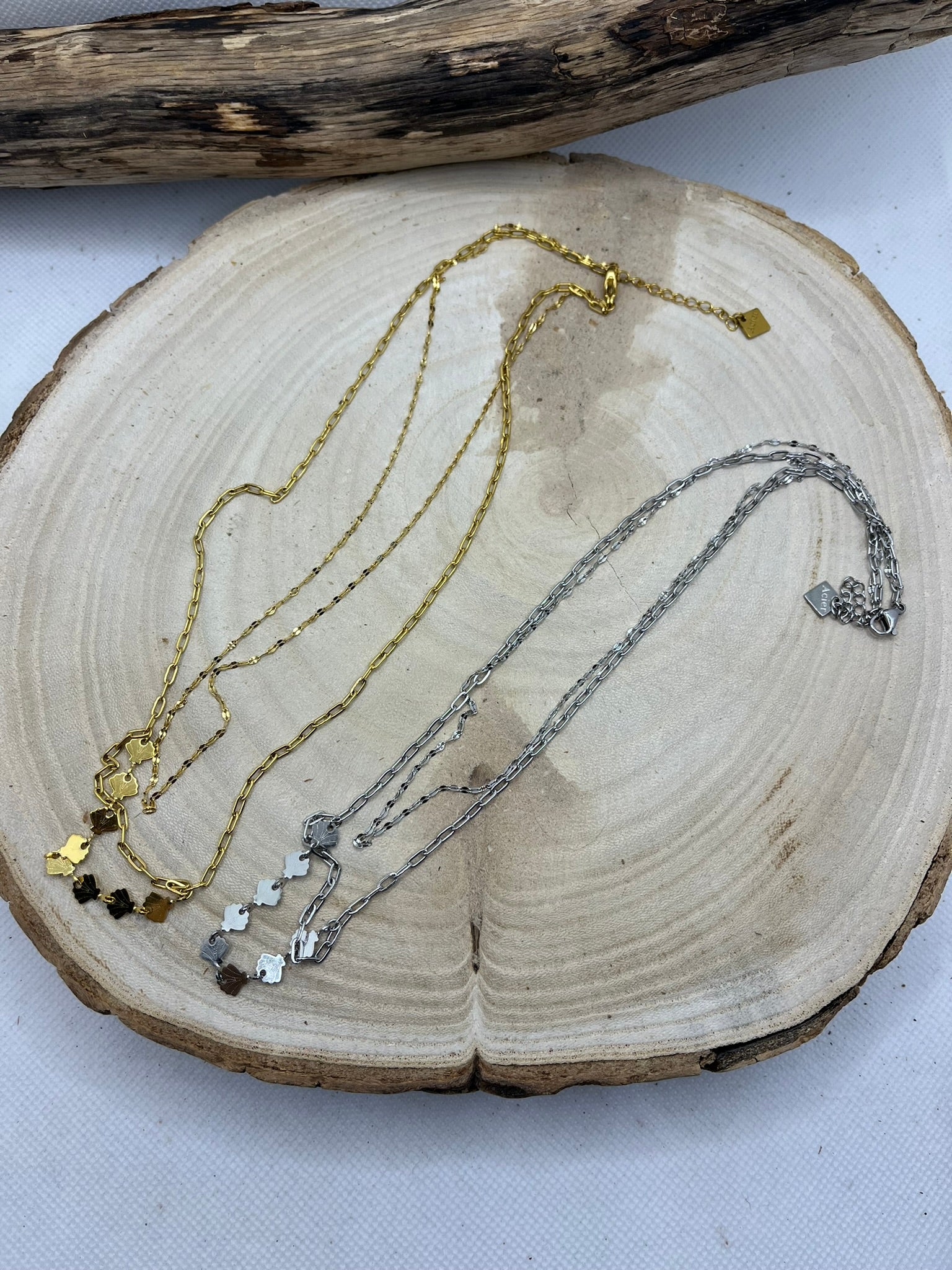 Ce collier élégant sur 2 chaines est un ajout parfait à toute tenue. Fabriqué en acier inoxydable de haute qualité, il est disponible en doré ou en argenté pour s'adapter à tous les styles.