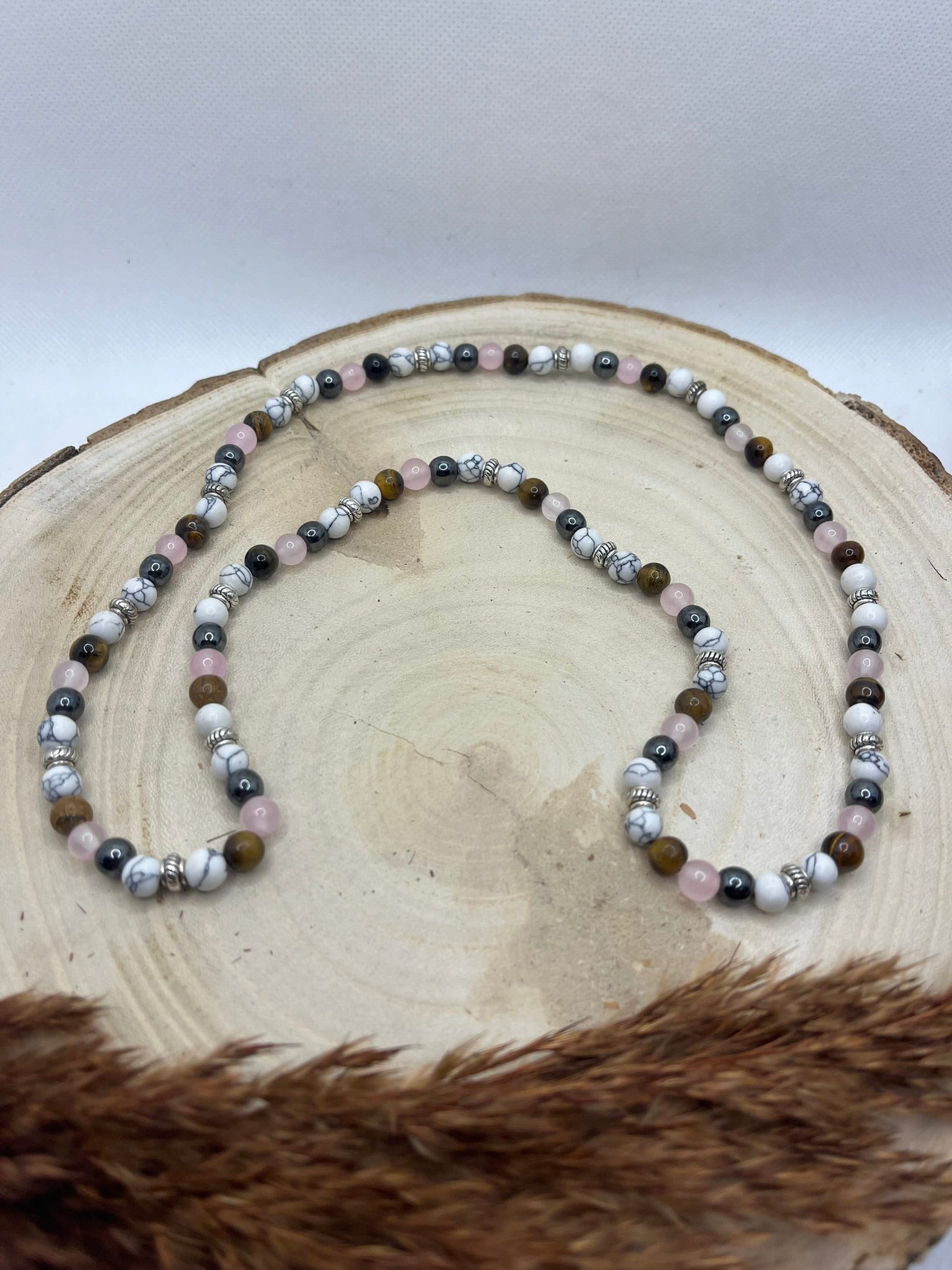 Collier sur élastique Pierre Naturelle Quartz rose, Howlite, Oeil de tigre et hématite