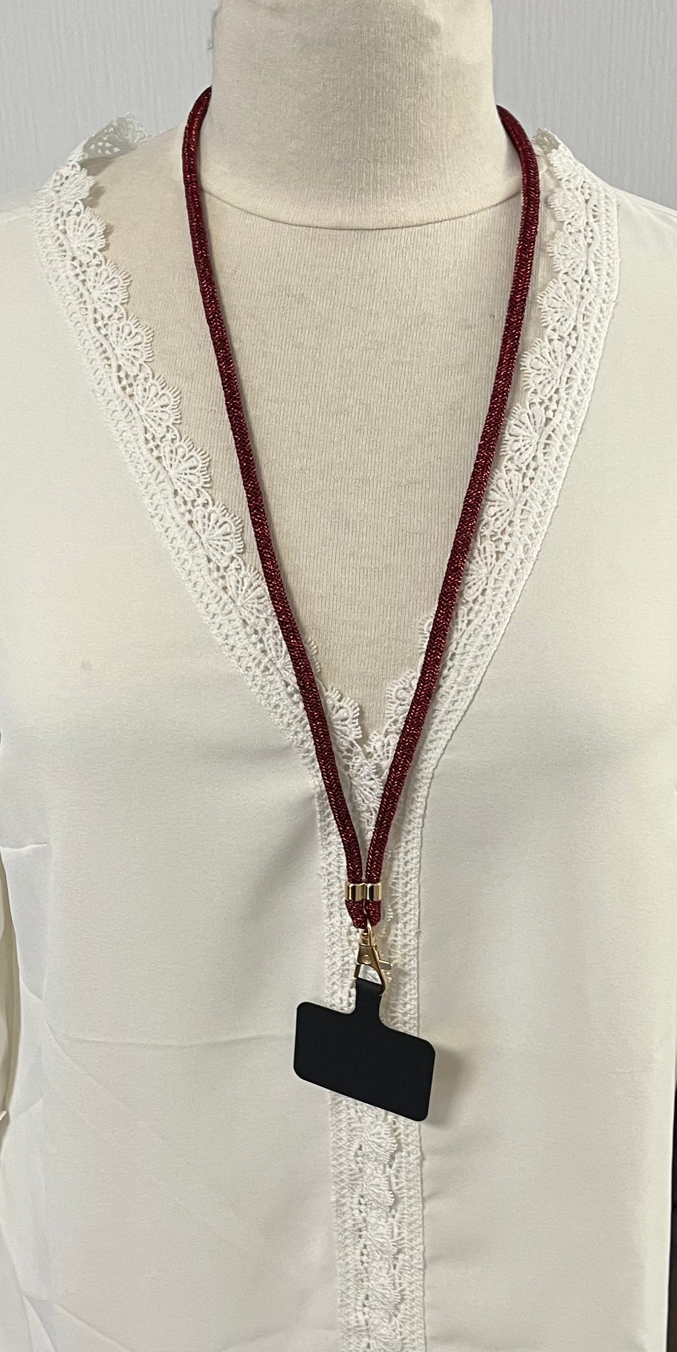 Le Cordon Téléphone Portable Bordeaux Brillant - Réglable avec Patch - Tour de cou est fait de polyester haute résistance aux déchirures, doux et confortable. Réglable et avec un patch, il convient à tous les téléphones portables et leurs coques sans grandes ouvertures en bas, permettant de garder vos mains libres pendant que vous êtes occupé tout en gardant votre smartphone en sécurité.