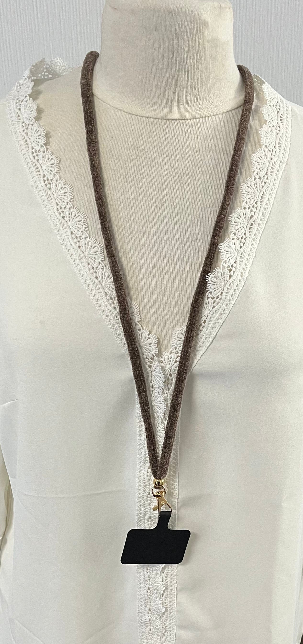 Cordon Téléphone Portable Taupe Velours- Réglable avec Patch - Tour de cou