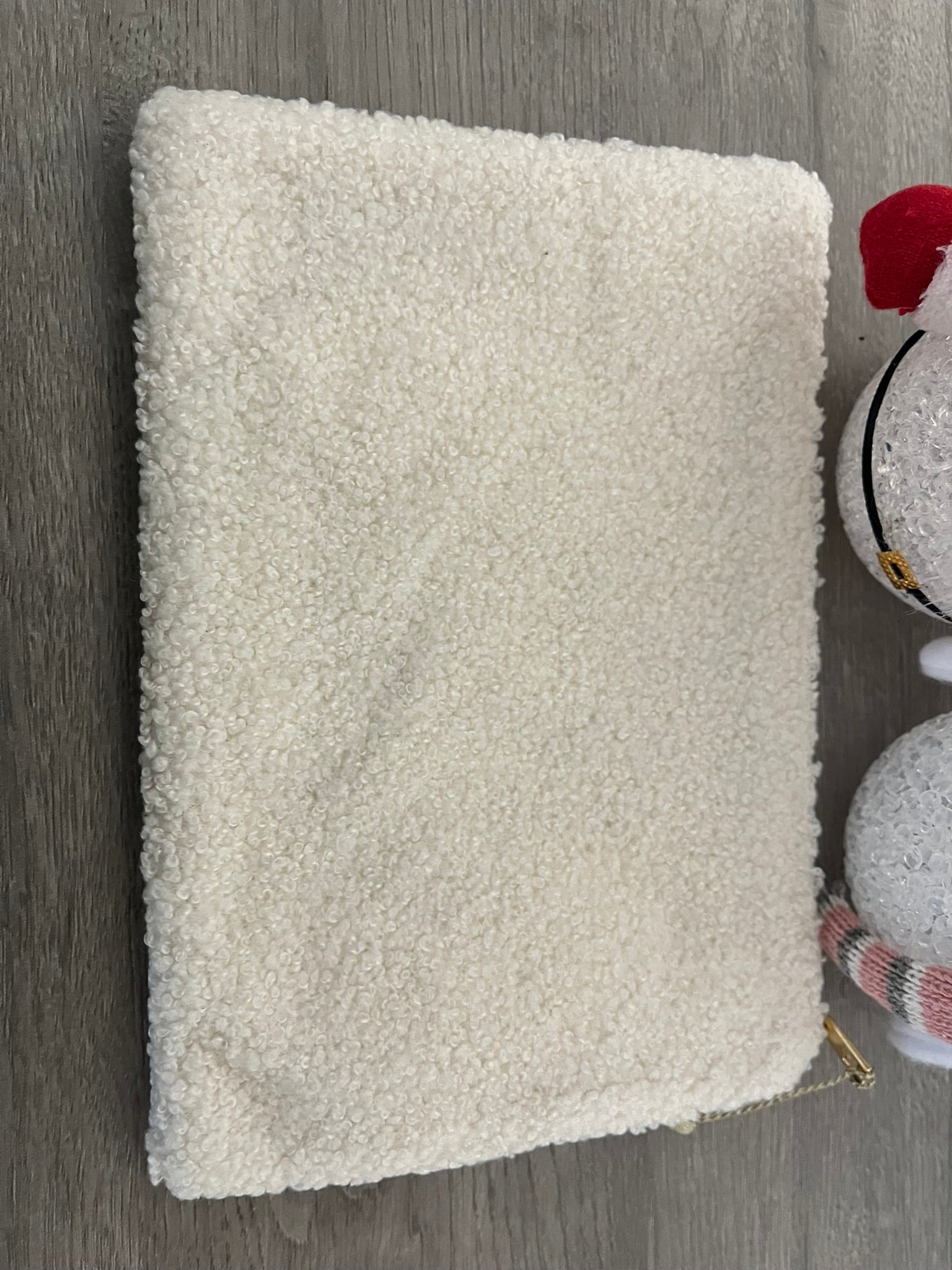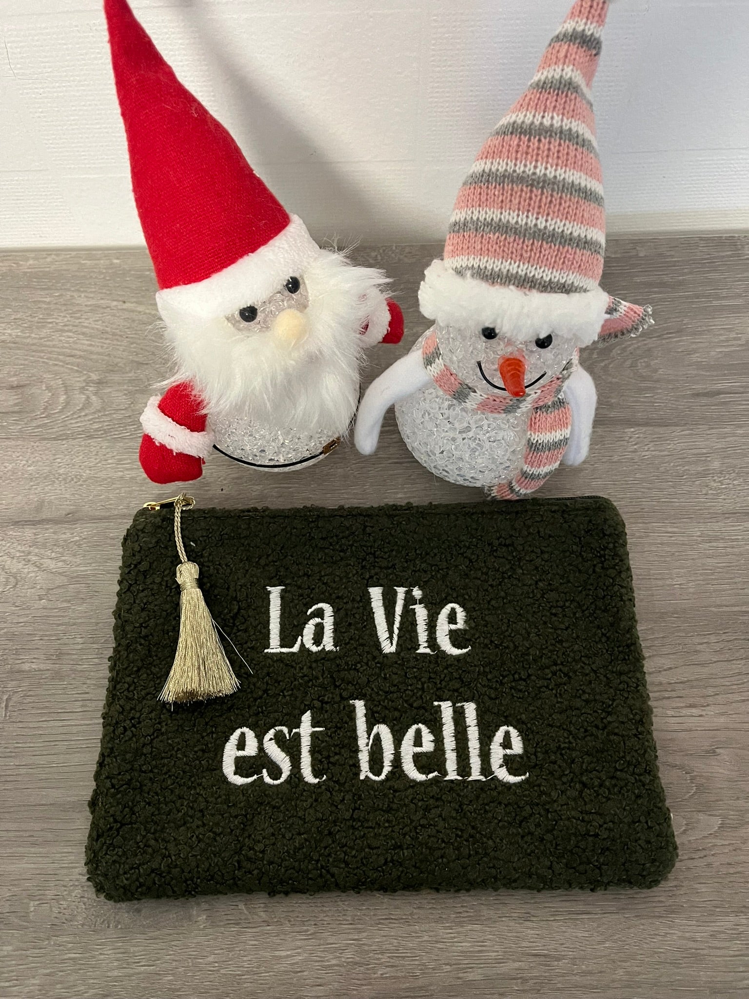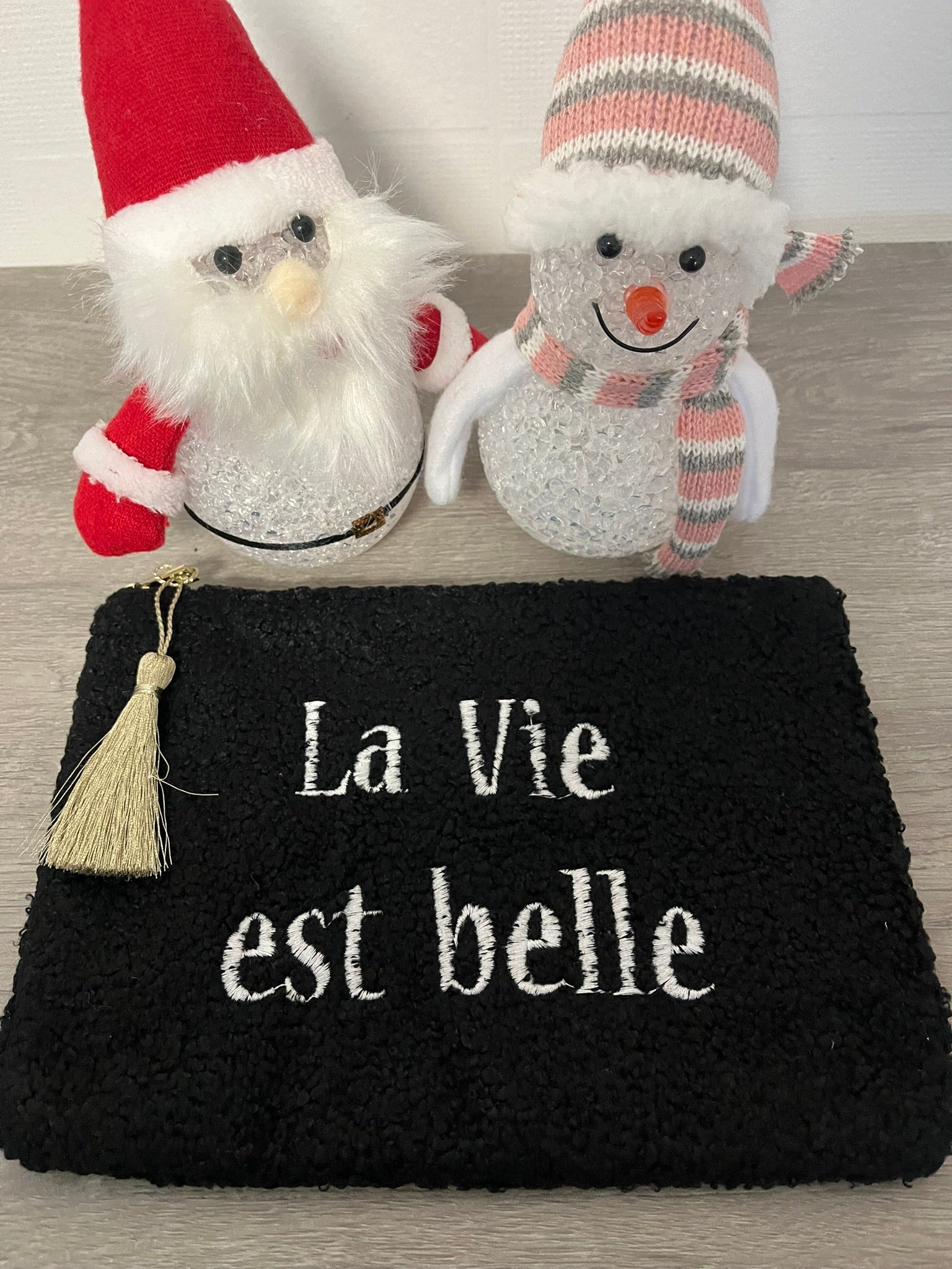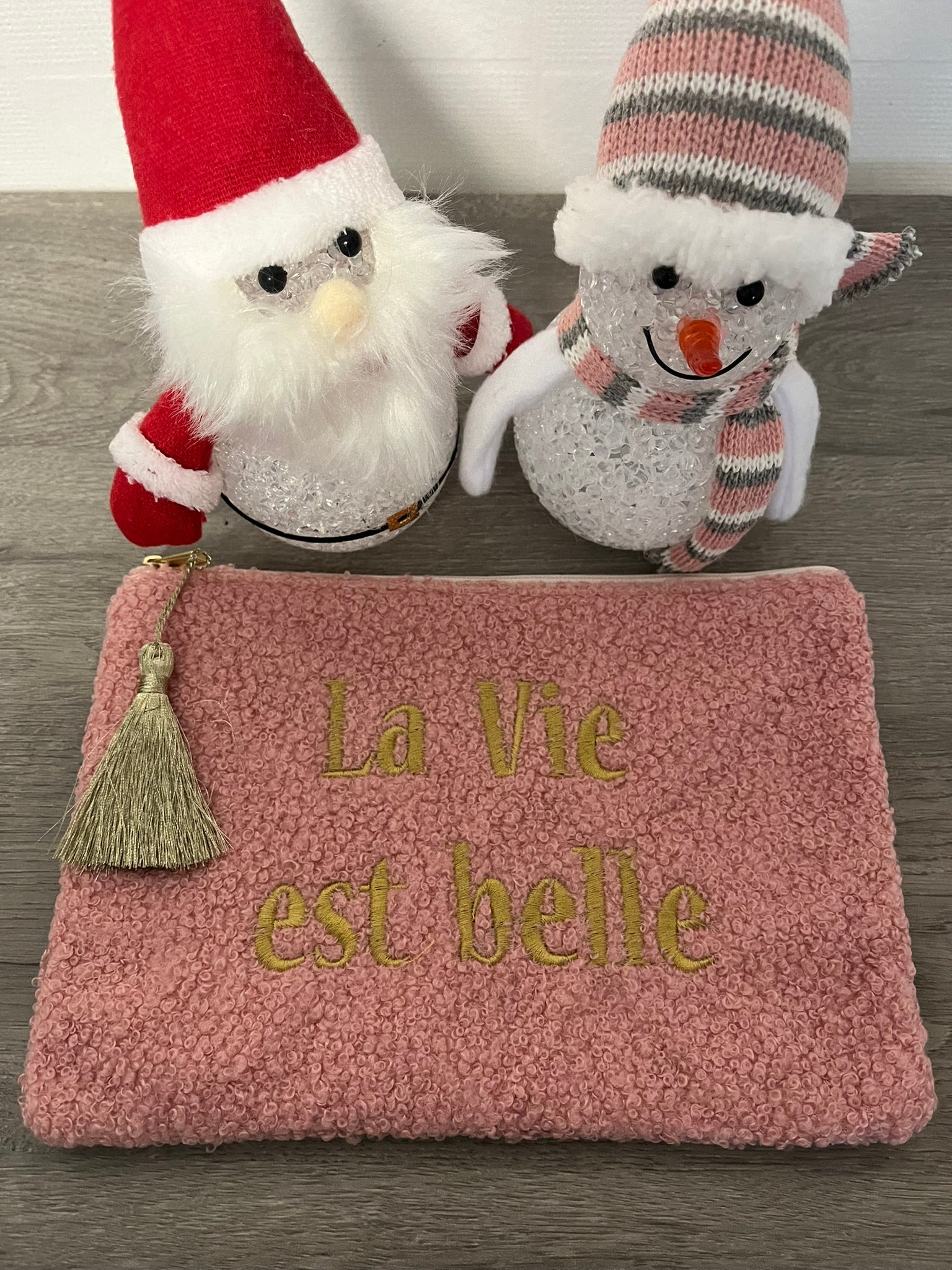 Trousse Pochette à Message ( LA VIE EST BELLE ) douce fausse fourrure avec pompon doré - fermeture éclair, idée cadeau pour femme et pour fille