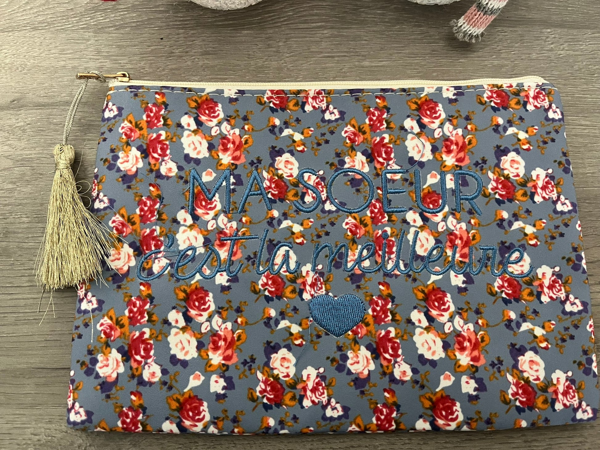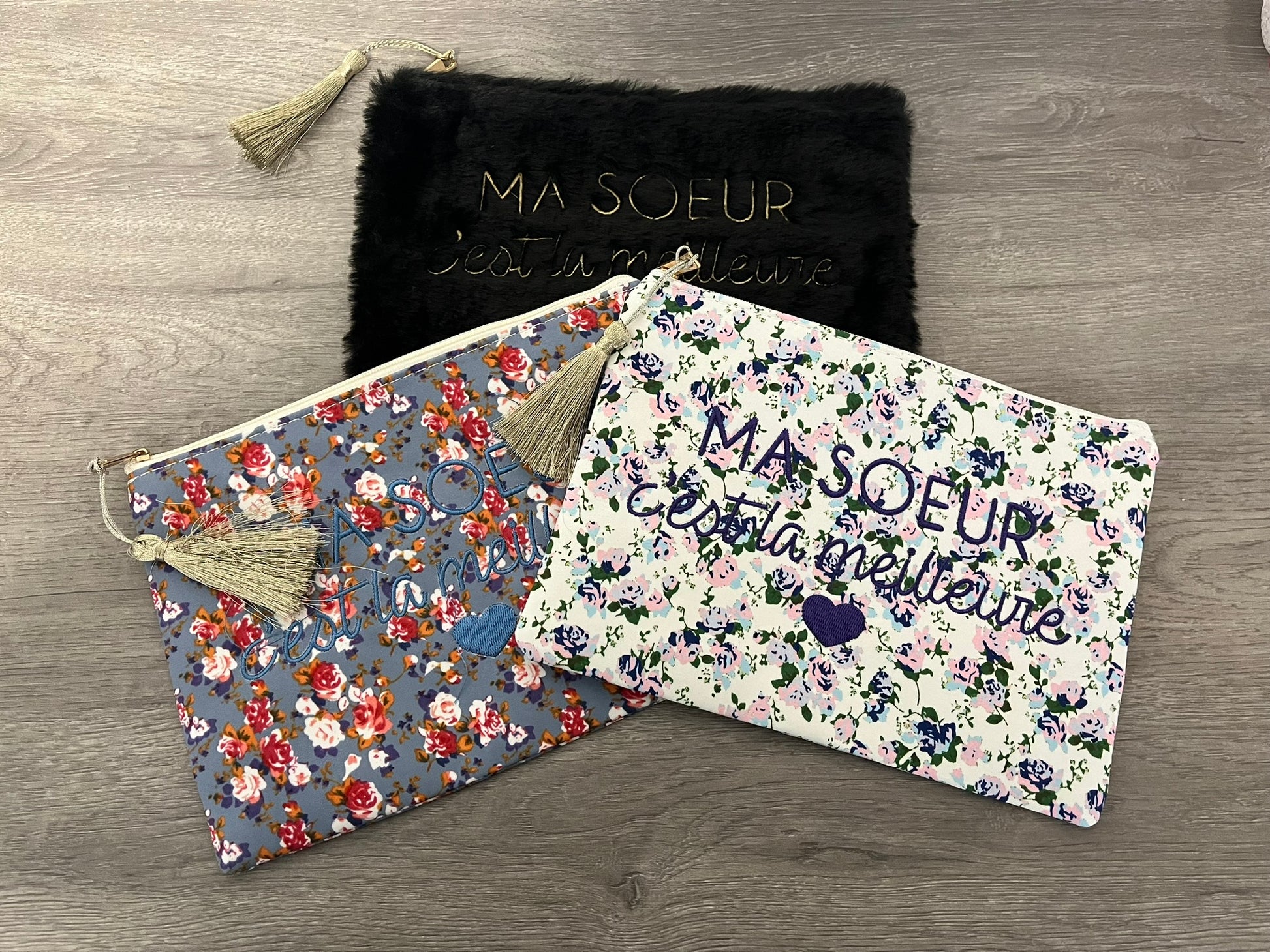 Trousse Pochette à Message ( MA SOEUR C'EST LA MEILLEURE ) fleurie et une en fausse fourrure avec pompon doré - fermeture éclaire - idée cadeau pour femme et pour fille