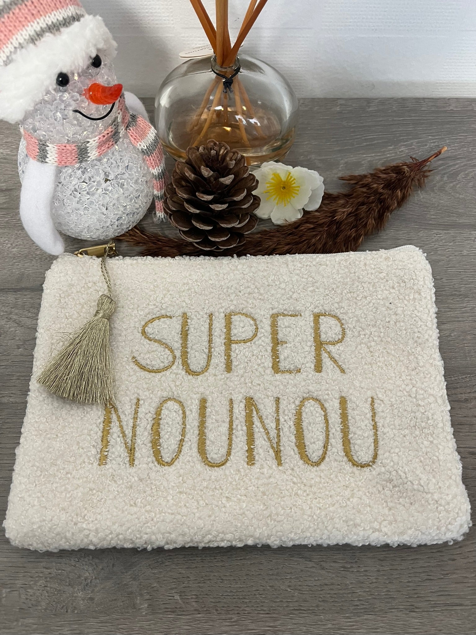 Trousse Pochette à message ( SUPER NOUNOU ) douce fausse fourrure avec pompon doré - Fermeture éclair - idée cadeau pour femme et pour fille